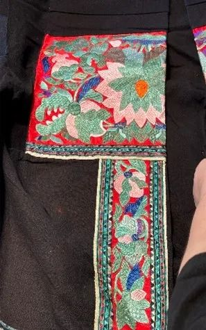 艳子老师带着队员们逐一参观工作室的锡绣藏品:一件百年锡绣嫁衣上,锡线在阳光下泛着温润的光泽,与青布底色交相辉映,纹样中暗藏着苗族的迁徙史与生活智慧。“锡绣的每一步都来不得半点马虎,从锡线的捶打、软化,到绣布的裁剪、纹样的勾勒,再到一针一线的固定,考验的是耐心,更是对文化的敬畏。”
