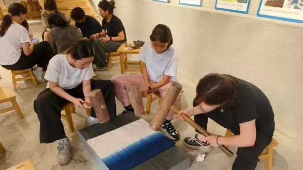 下午实践队于植物染坊开展侗族植物染研习活动:研学植物染知识与原料,如薯莨,蓝靛等。掌握侗族亮布的制作过程和基本方法,通过蛋清上亮,蒸布与捶打等环节,亲手体验布匹染制的天然质感。