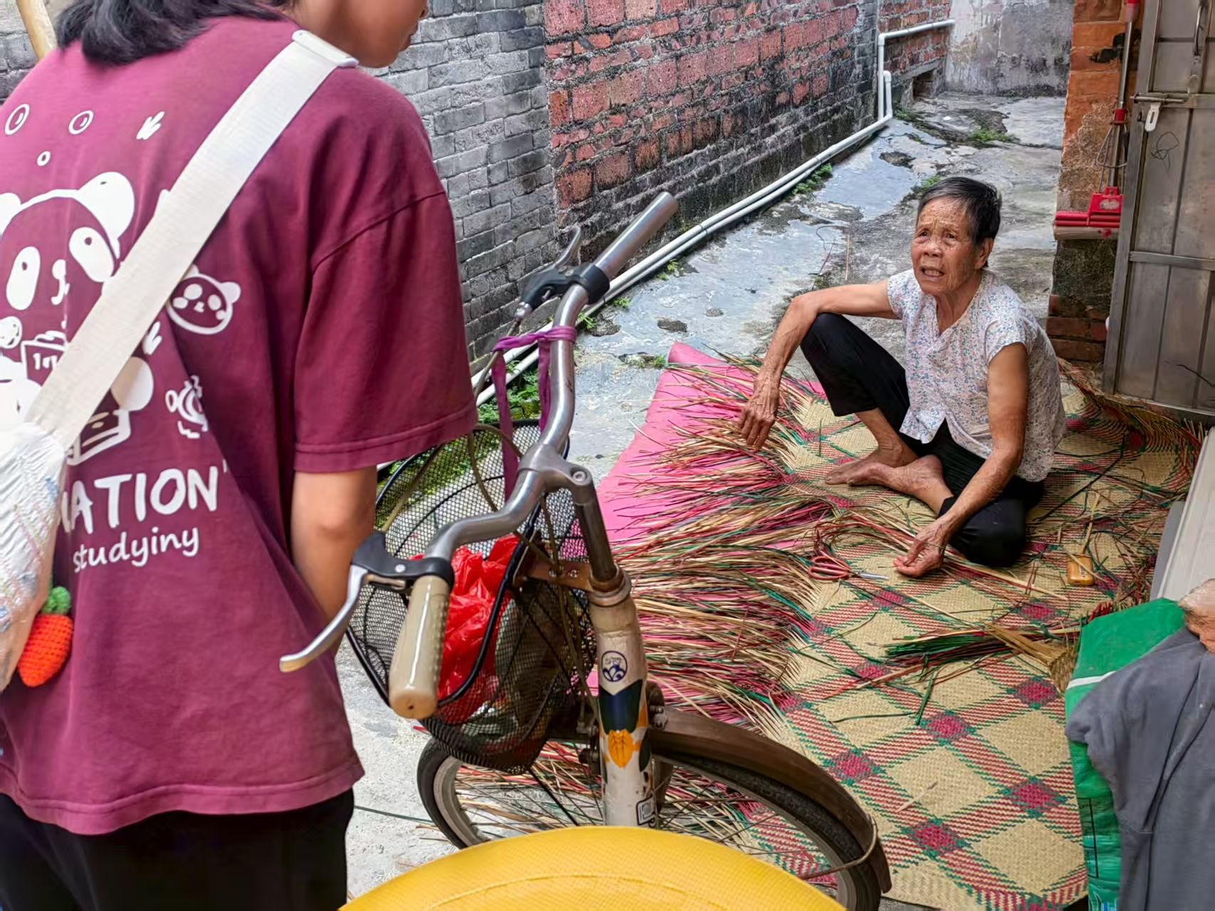 一位八旬编席奶奶李阿婆让队员们见识到了手工技艺的传奇魅力。草编席是坑尾村的传统技艺,国家非物质文化遗产,曾是远销国内外的送礼佳品。老人双手布满岁月痕迹,却依然灵巧地将芏草编织成精美席子。“这芏草要晒七天,舂的时候得顺着纤维,不然编出来的席子会散。”李阿婆说,她年轻时曾用细如发丝的芏草编织“生活快乐”“坑尾放眼世界”等字样。