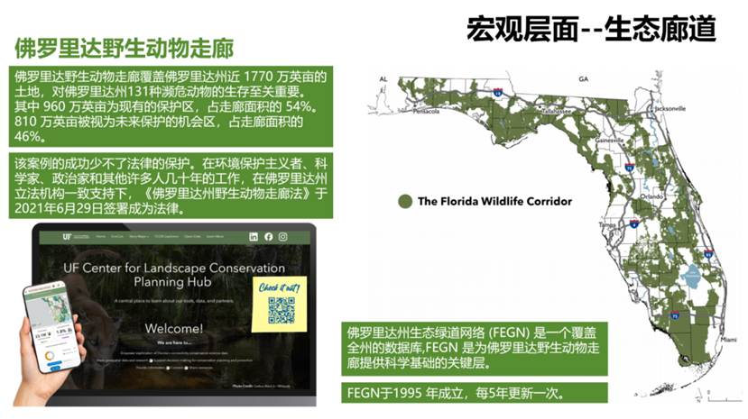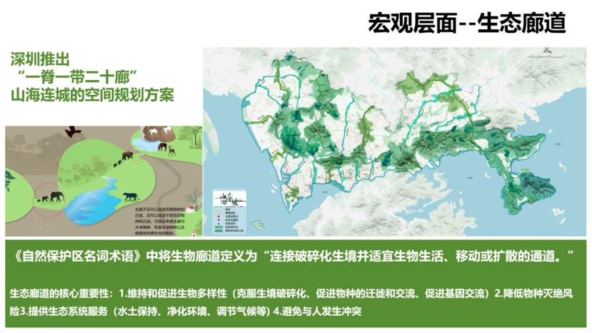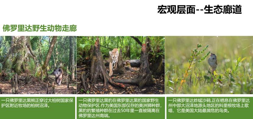 生态廊道案例:深圳的“一脊一带二十廊”规划、佛罗里达的野生动物走廊等。