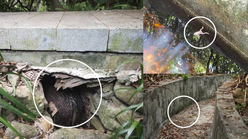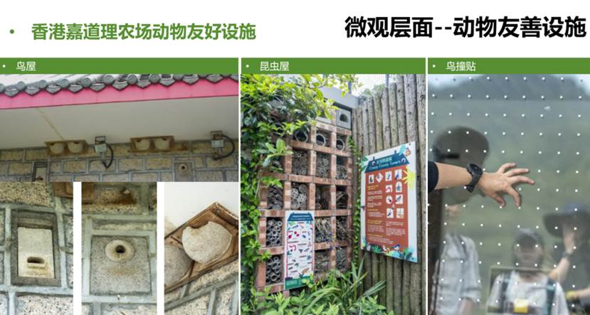 动物友善设施案例:香港嘉道理农场的鱼道、鸟屋、蝙蝠屋、鸟撞贴等。