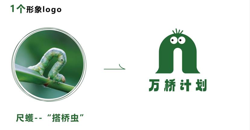 “万桥计划”有1个形象logo——原型“尺蠖”,又名“搭桥虫”,它移动时就像一座桥,象征“搭桥”不过是留道缝隙、放块木板的顺手之举。